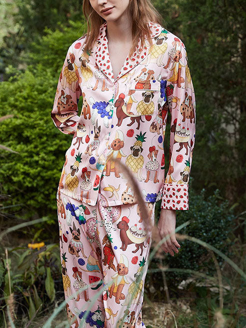 Plaid Wine Glass Print Pajama Set Long Sleeve Shirt