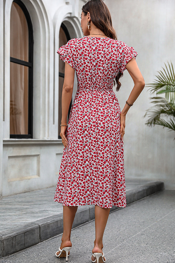 - Floral Print V Neck Frill Casual Dress
