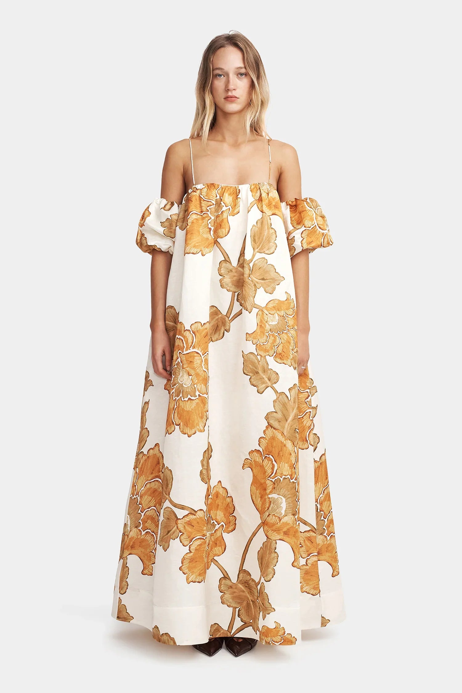 The Vetiver Dress is a gorgeous voluminous maxi length dress with a low straight neckline and detachable puff sleeves. The dress has an A-line shape through the body and is fully lined. Pair with your favourite heels, the Vetiver is perfect for your next special event.