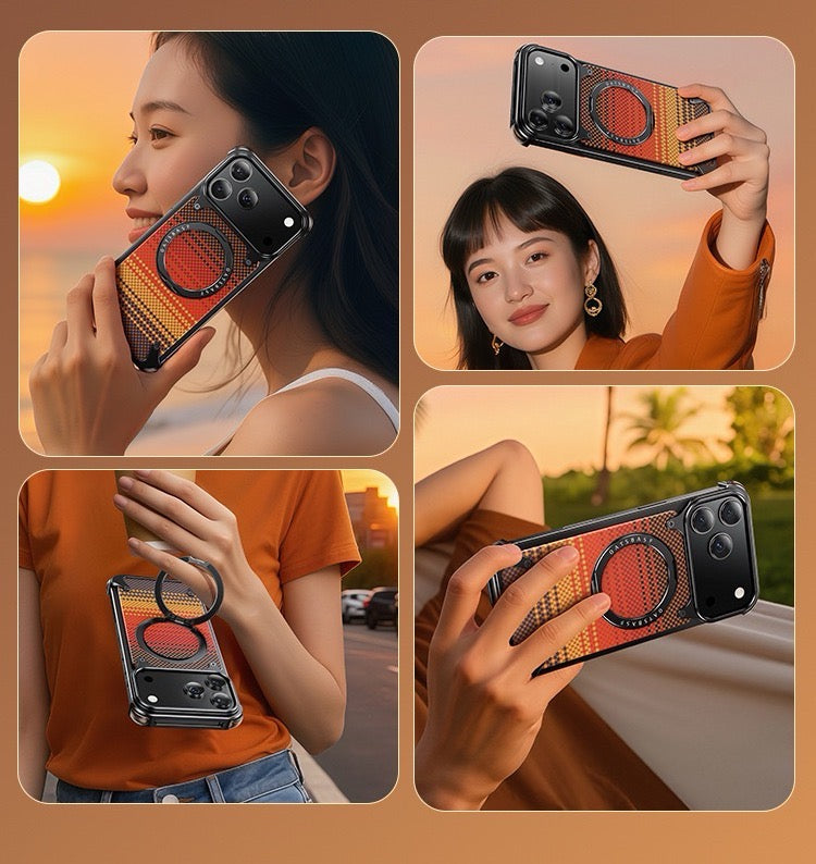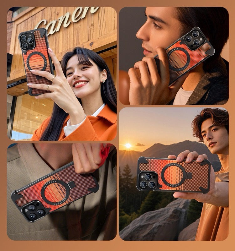 Elevate your device with the Kevlar Carbon Fiber Pattern Magnetic Bracket Phone Case. Available in Red Flame, Night Scar, and Deep Sea Blue for iPhone 17 Air, iPhone 17 Pro, iPhone 17 Pro Max, iPhone 16 Pro, iPhone 16 Pro Max, and Samsung S25 Ultra, it combines premium protection and distinctive style.